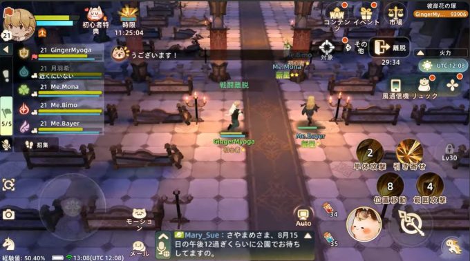 オンラインMMORPGらしく、他プレイヤーとの交流が楽しめます。ギルドシステムや共闘バトル、PvP(プレイヤー対戦)など、友達や他のプレイヤーと一緒に冒険できる点も魅力です。